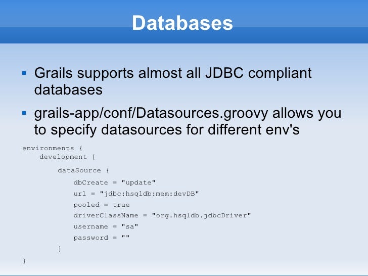 Then, with Grails 2 execute: Check out this stackoverflow. Grails 2 has switched to H2 as the default instead, and so if you try to run your application you'll see this warning: Type in a Connection Name: Learn to use GORM. Not that hard, kind of baked in to the framework--as long as you're working with a Grails model, pretty trivial, no? hhsqldb